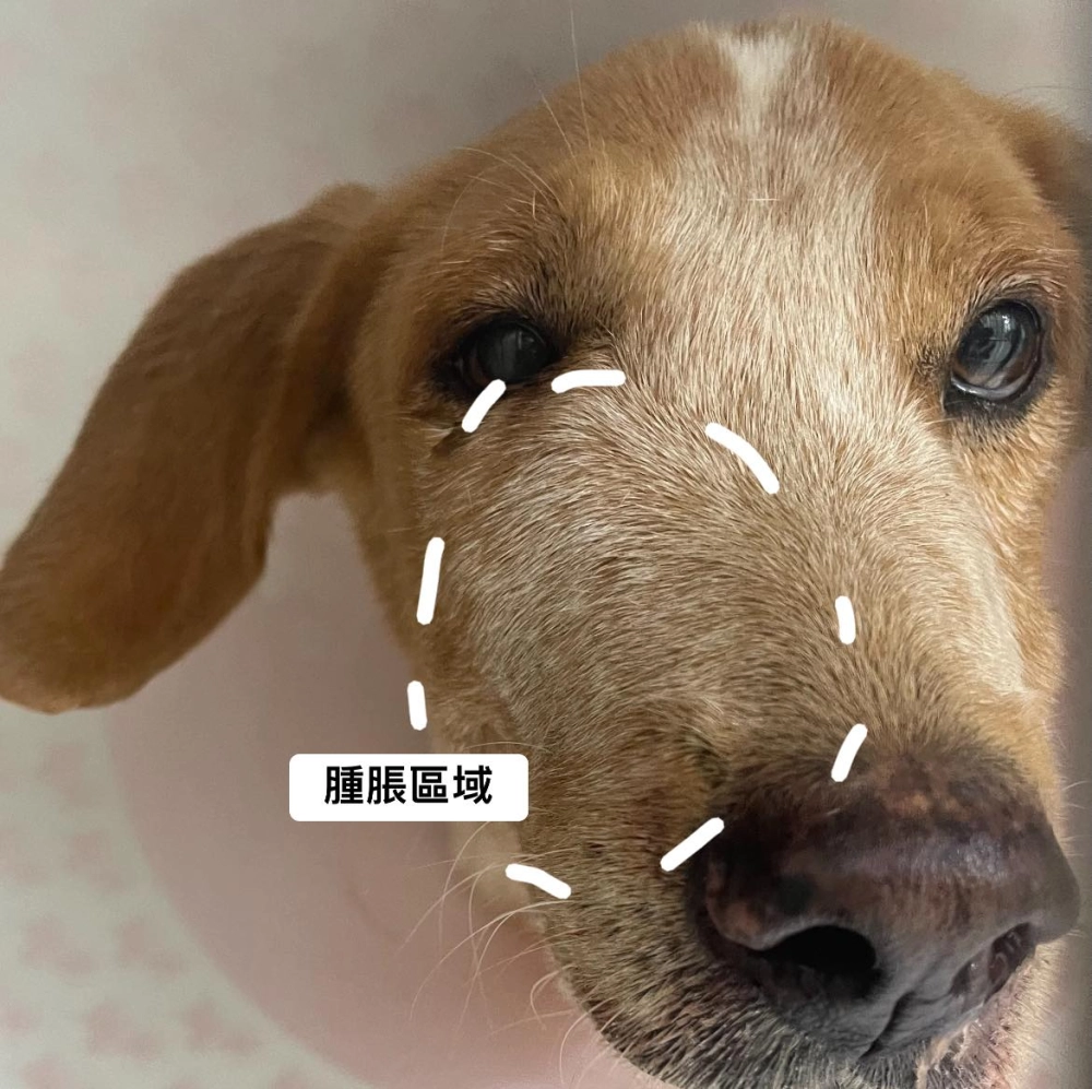 明顯看到狗狗顏面的腫脹,甚至造成眼睛張不開,但光是從外觀,完全無法確定病因