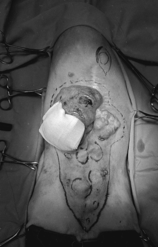 腫瘤幾乎大到要在地面拖行,潰瘍的區域在手術中以無菌耗材層層包覆儘量減少污染切創區域的機會。