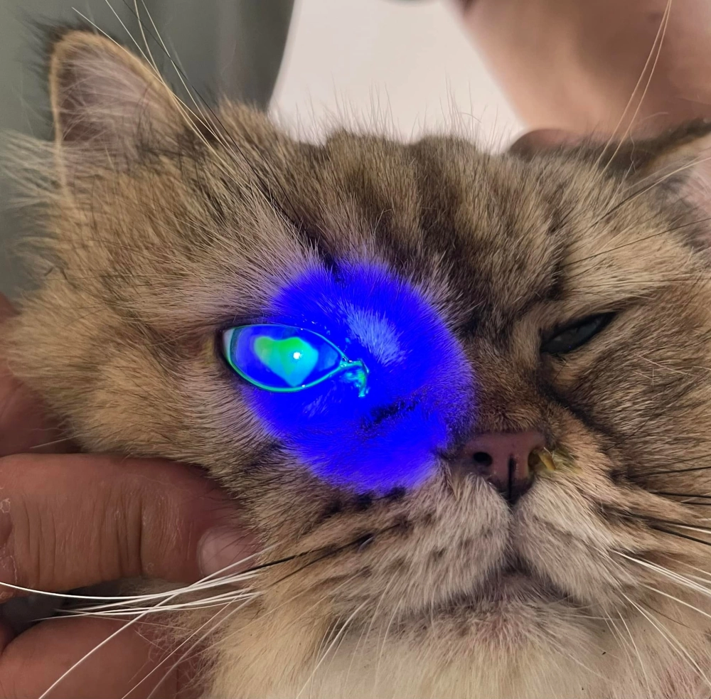 眼睛眯眯的,但眼壓都正常,染色檢查就發現很大片的角膜潰瘍。